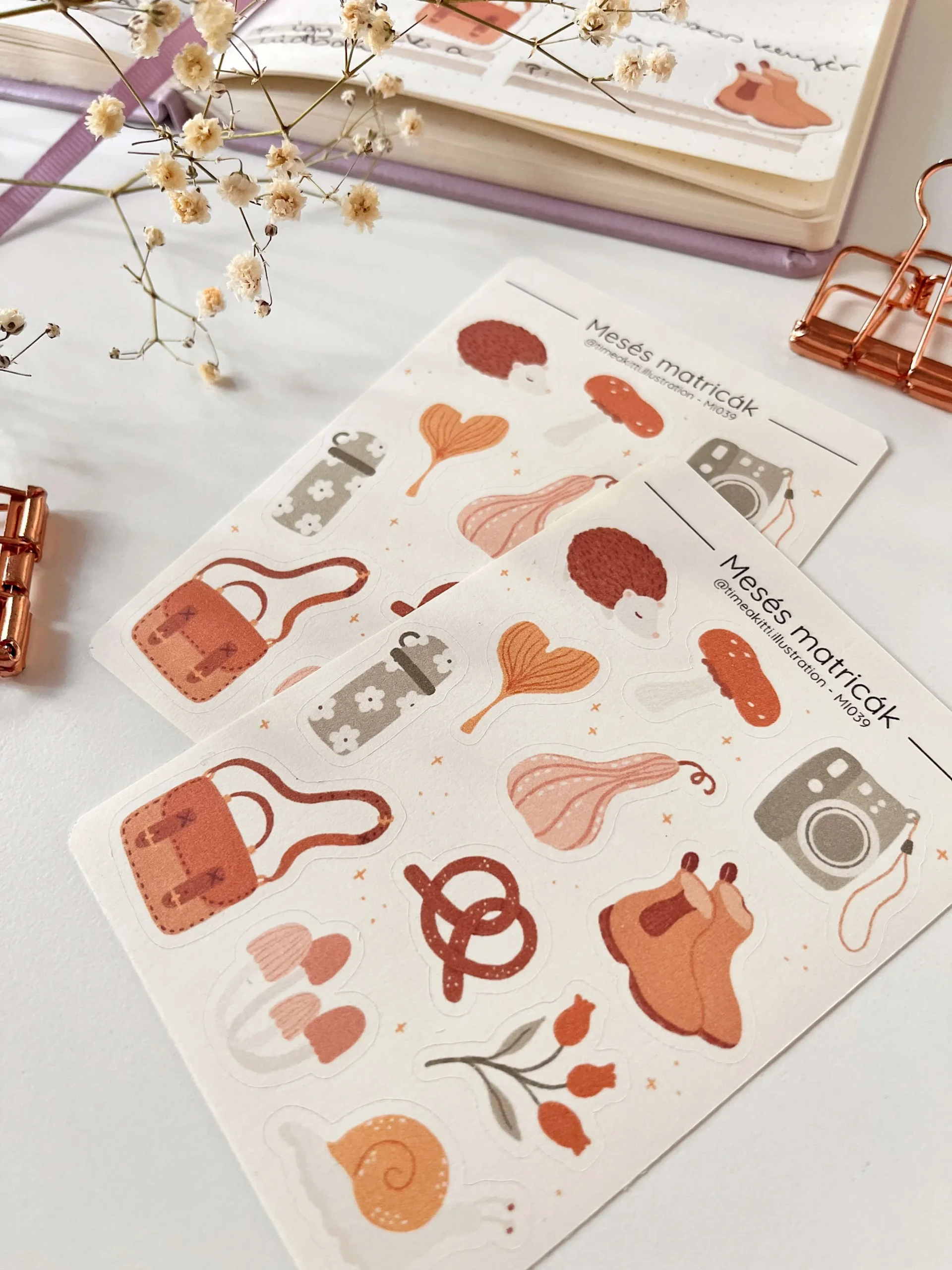 Ez a matricacsomag tele van barátságos, mesés, kézzel rajzolt illusztrációkkal: vidám sünnel, gombákkal, csigával, őszi levelekkel, egy páros csizmával, kamerával, pereccel és termoszokkal. Minden elem egy-egy pillanatot idéz fel egy hangulatos erdei hétvégéből, amikor a természet színei és illatai körülvesznek minket.